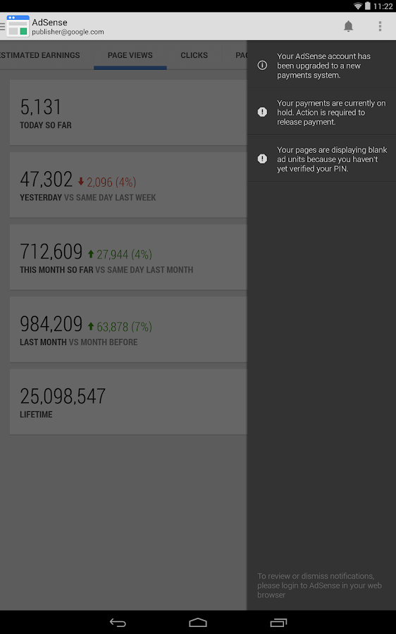 جوجل أدسنس هو برنامج إعلاني من تصميم وتطوير شركة جوجل يقوم فيه صاحب أي موقع بوضع كود شركة جوجل .. فيظهر مكان الكود إعلانات يأخذ عنها صاحب الموقع عمولة عن كل زيارة أو ضغطة على الإعلان .. والكثير منا لا يتاح لهم متابعة أرباح مواقعهم في برنامج جوجل أدسنس من خلال الحواسيب نظرا لإننا في عصر الحركة المستمرة .. وأصبحت الهواتف الذكية تحل محل الحاسب الشخصي كثيرا .. والأن أصبح بإمكان أصحاب المواقع متابعة أرباحهم لحظة بلحظة من خلال تطبيقات معرفة بيانات وأرباح جوجل أدسنس المنتشره على جوجل بلاي .. ولكنها ليست أمنة للجميع ولذلك أحببنا أن نقدم إليكم رابط تحميل تطبيق جوجل أدسنس الرسمي . والتطبيق لا يظهر فقط أرباحك اليومية بل كل إحصائياتك وبياناتك المتاحة في لوحة تحكم الحاسب الشخصي أيضا من قنوات وزيارات وجمهور وغيرها .