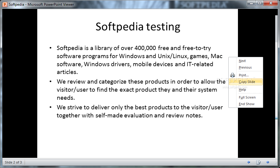 Microsoft PowerPoint Viewer is a good option when it comes to accessing PowerPoint presentations, especially since it comes without any cost and it supports files created in PowerPoint 97 or later.