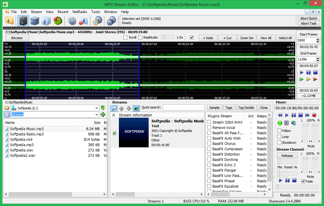 MP3 Stream Editor comes packed with many dedicated parameters designed to help you view comprehensive information about the audio streams (e.g. size, bitrate, channel, frame size, ID3 info, mode), pick a start and end frame, and play, pause, or stop the current audio selection.