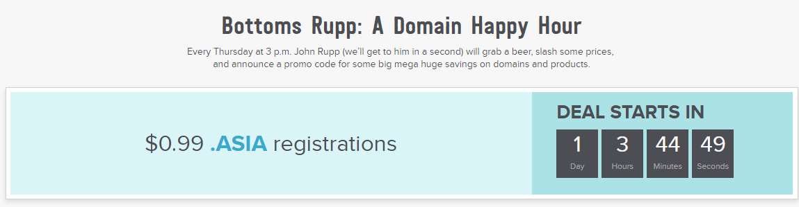حيث تقوم شركة name.com كل خميس بعرض تخفيضات لنطاقات مختلفة الساعة 3 p.m. MDT (UTC-6) on Thursday - اي تقريبا الساعة الواحدة بتوقيت مكة المكرمة.